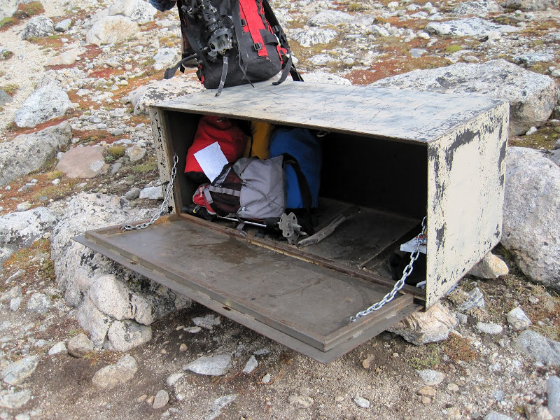 Steph and I woke early the next day, with gear packed for the multi-day carryover and the extra food, fuel, and luxuries packed separately to be left at the Lower Saddle as a cache. There was a food storage box that was convenient for this, to keep our gear dry and safe from varmints.