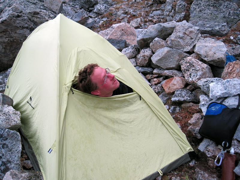 This second storm was stronger than the first one. First the rain came hard and started to soak through the tent membrane again as the wind buffeted the tent and lightning struck the peaks above. Then the rain changed to hail, which hammered the walls of the tent, sending water spraying all over the interior of the tent. It was a good thing that we had left our down sleeping bags packed away! Seeing this potential problem, I was glad that I had a bivy sack liner for my bag. Steph and I decided that she could probably get some protection for her bag by spreading my rain poncho over it, and keeping it packed away until we were ready for bed.