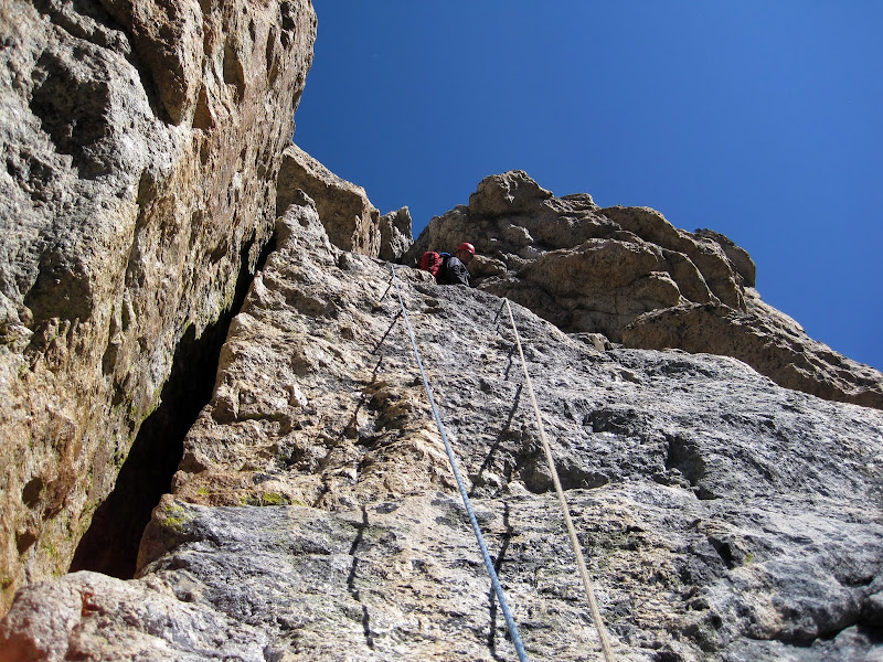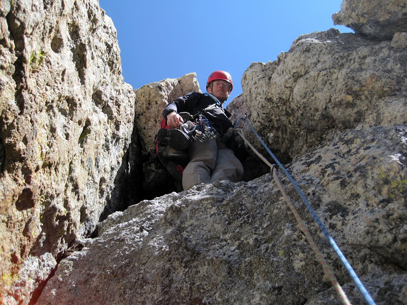 At last we were nearing the end of the climb. I followed up and over the 4th Tower and down into a large notch. Here our information indicated a bypass option, but I was feeling good and set upon finishing this climb properly. This final pitch was listed as 5.7 A1 or 5.9 chimney or stem. Somehow it seemed like none of this to me. It was no the last pitch, it would go at 5.7 C0 if you brought micronuts and were more gutsy & adept at aiding off of them than free climbing a short offwidth, and the crux itself presented no stemming or chimneying except as an afterthought. You'd better have your Wyde hat on for this one!