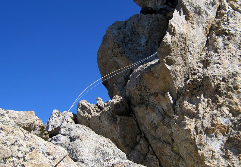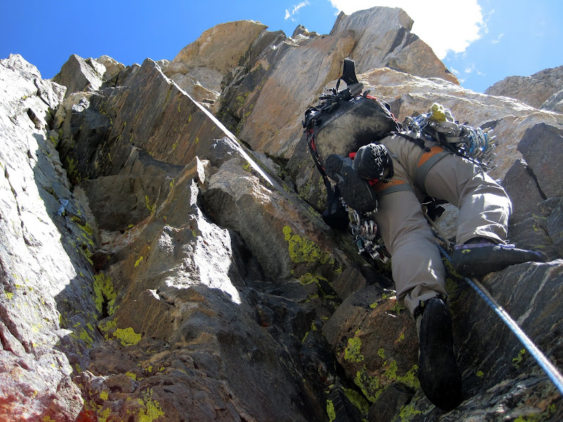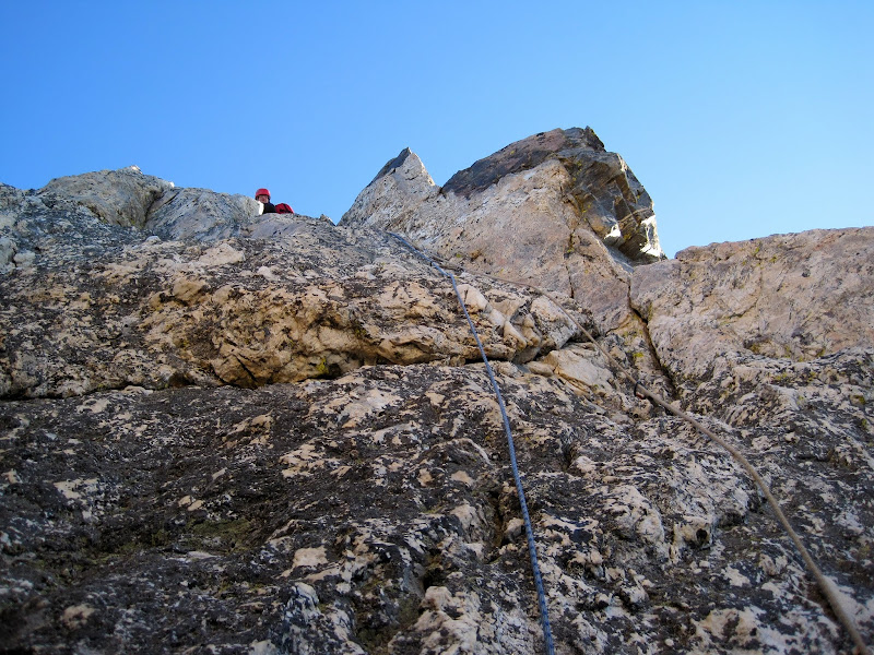 The class 3 terrain led to an ugly, cold, wide corner. However, there was a fun looking flake to the left, so I face climbed up to it where I underclined and liebacked up to the ridge crest, placed my last piece, then did a hand traverse back over to the wide corner and up the remaining ridge to a nice belay spot. I guess this part was the famed 'knife edge' ridge of the climb. Narrow, yes, but nothing like Matthes Crest or the Palisade Crest.