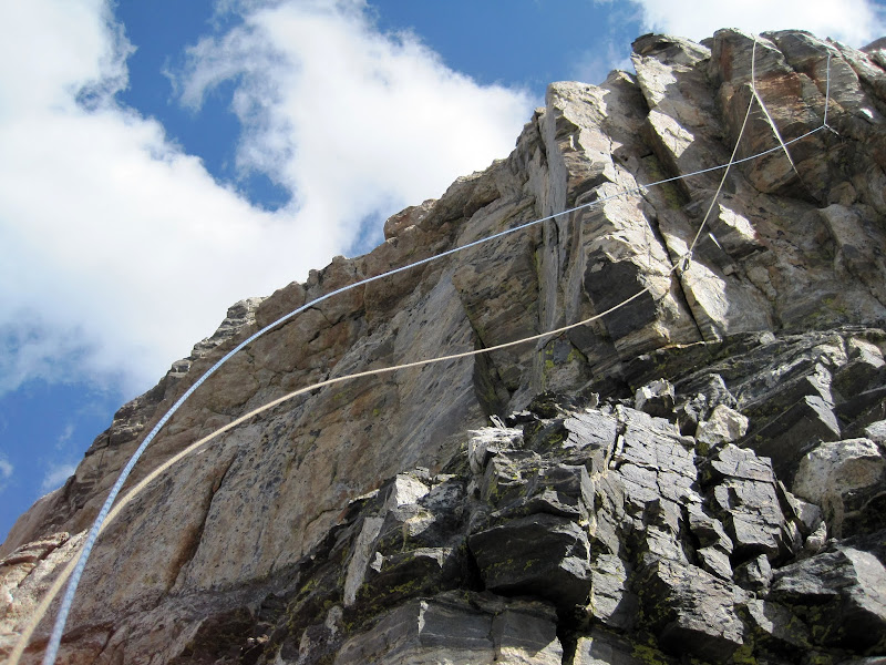 Steph followed up quickly and learned (for the both of us) that the feldspar crimpers sticking out of the gneiss can and do in fact rip off. She tore off one of the last ones I used before I placed my only piece for the face! Hmm . . .