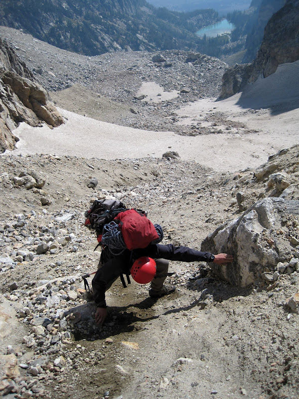 Teepe Glacier & Nez Perce. There are Exum Guide huts at the far end of the moraine here. Take note, when we knocked some rocks loose, they went to the far end of the glacier and smashed into the terminal moraine. Don't hang out there!